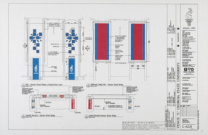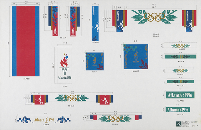 For the Centennial Torch logo, ACOG selected a Classical-inspired design that combined the aesthetics of a Greek column, the five Olympic rings, and rising stars as flames. The logo was beautiful, but many in the Atlanta art community grumbled that the design firm that made it was based in San Francisco. Iranian-American sculptor Siah Armajani designed the Olympic cauldron, to be lit the night of the opening ceremony, at the top of a bright white structure that bridged the two Olympic stadiums and was meant to be climbed. But after the design was unveiled, the first designed by an artists and not an engineer, many journalists were quick to compare the multi-colored metallic spiral to a cup of French fries. (Armajani would later disown the project over his contentious working relationship with ACOG.) And with time running out to create a coherent symbolism for their marketing materials, a “Look of the Games” committee brainstormed the use of leaves—to represent Greece, the home of the original Olympics—and a quilt, a common motif of Southern culture. A hand drawn-looking “Quilt of Leaves” design then went up on the official website, the side of venues, advertisements and tickets, tourist maps and MARTA decals, and this quilt symbolism would be the only visual (with the notable exception of Blaze the phoenix, the Paralympic Games mascot) from the 1996 campaign at all related to Atlanta.